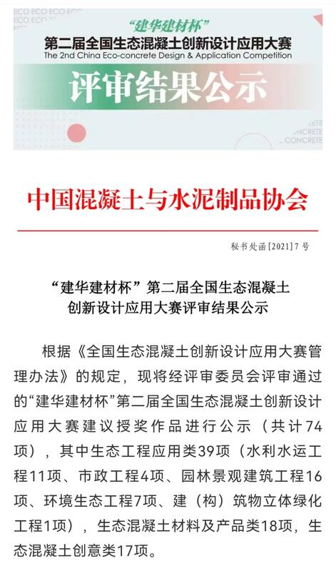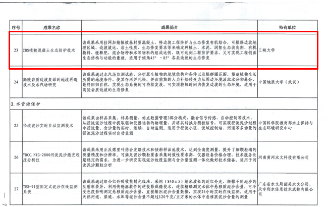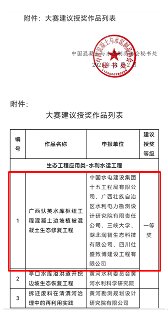 為深入貫徹落實習近平總書記關(guān)于保障國家水安全重要講話精神,積極推動新階段水利高質(zhì)量發(fā)展,切實做好成熟適用水利科技成果推廣運用,切實提高行業(yè)科技水平,水利部組織開展了2021年度成熟適用水利科技成果的征集、評審與公示工作。我公司研發(fā)的核心技術(shù)“CBS植被混凝土生態(tài)防護技術(shù)”獲得入選,其應用項目“廣西馱英水庫樞紐工程混凝土邊坡植被混凝土生態(tài)修復工程”在2021年度“建華建材杯”第二屆全國生態(tài)混凝土創(chuàng)新設(shè)計應用大賽榮獲一等獎。