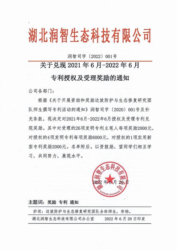 湖北潤智生態(tài)科技有限公司關于兌現(xiàn)2021年6月—2022年6月專利授權(quán)及受理獎勵的通知(潤智司字〔2022〕001號)